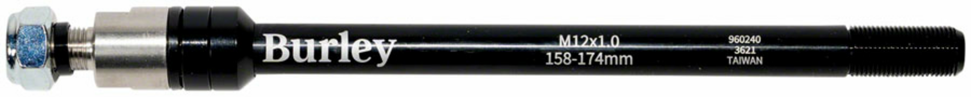 Burley's adapter for bikes with a 12mm thru axle. Stock thru axles are not able to accommodate any sort of axle mounted hitch system. These thru axles have an external male threading on the end to accommodate the installation of Burley's axle mounted hitch system.