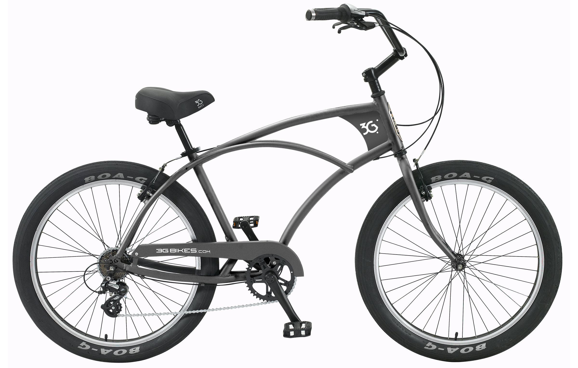 The Newport seven-speed beach cruiser is all about easy-styling it through the neighborhood. With a lightweight and rustproof aluminum frame, fat 26 x 3.45-inch tires, and a laid-back riding position, the only worry you'll have is how to carry your board and the coffee as you roll out to check the surf. Newport's retro-styled frame puts 3G's unique touch on classic design, and the extra-comfy padded seat features elastomer springs to keep you planted in the sweet spot on longer sunset rides. Tall, swept-back bars finished with double-density rubber grips, versatile platform pedals, and mounts for a rear rack and fenders complete this urban pleasure craft.