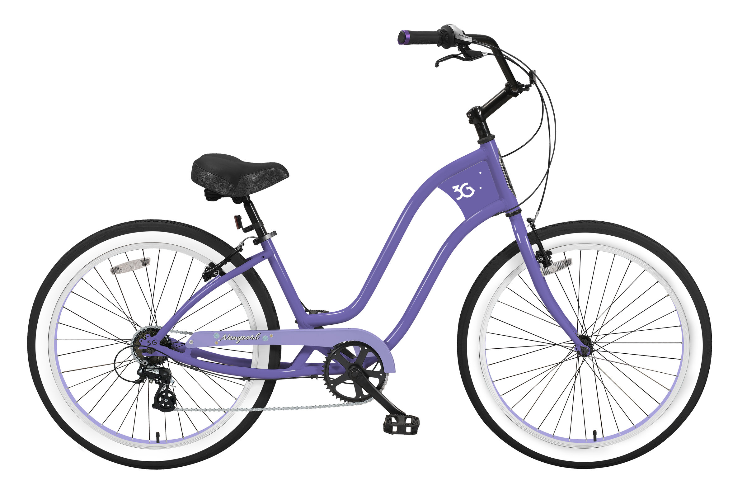 The Newport seven-speed women's beach cruiser is all about easy-styling it through the neighborhood. With a lightweight and rustproof aluminum frame, fat 26 x 3.45-inch tires, and a laid-back riding position, the only worry you'll have is how to carry your board and the coffee as you roll out to check the surf. Newport's retro-styled frame puts 3G's unique touch on classic design, and the extra-comfy padded seat features elastomer springs to keep you planted in the sweet spot on longer sunset rides. Tall, swept-back bars finished with double-density rubber grips, versatile platform pedals, mounts for a rear rack and fenders, and a sweet step-thru frame complete this urban pleasure craft.
