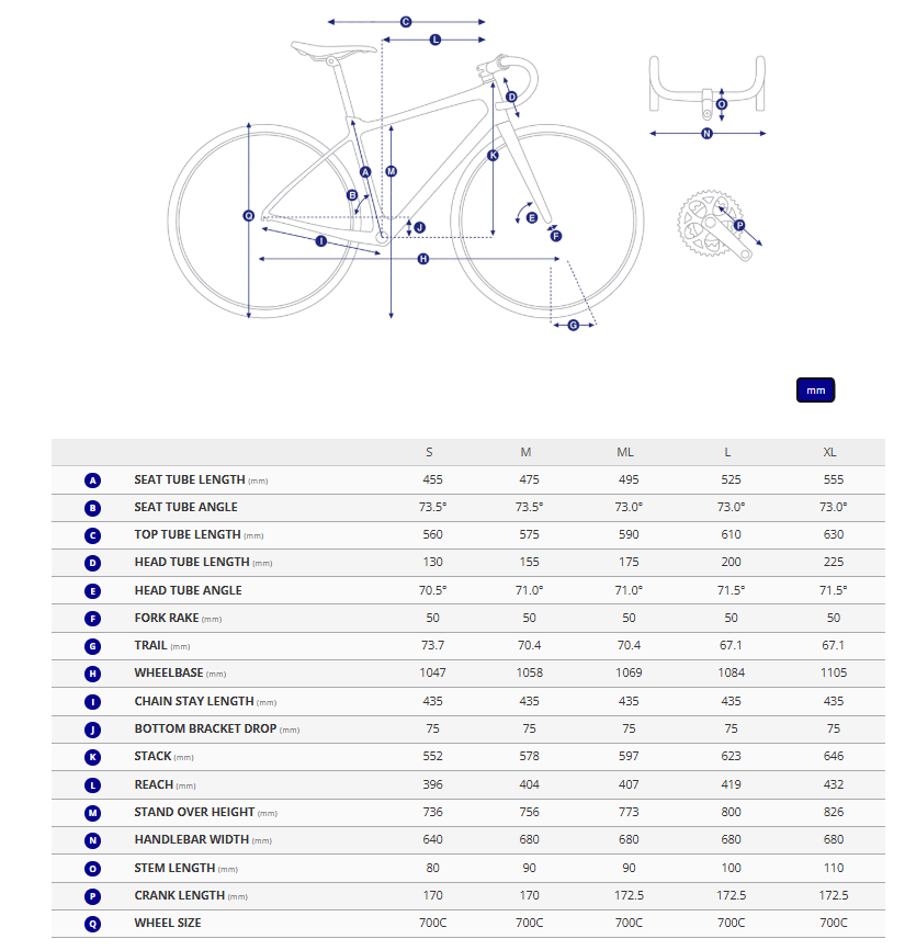 | Crankset | FSA Omega AGX+, 42t XS:170mm, S:170mm, M:170mm, M/L:172.5mm, L:172.5mm, XL: 175mm |