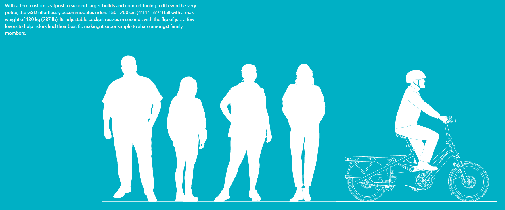- Easy-sharing cockpit adjusts without tools to fit riders 150 - 200 cm (4'11" - 6'7") tall and weighing up to 130 kg (287 lb)