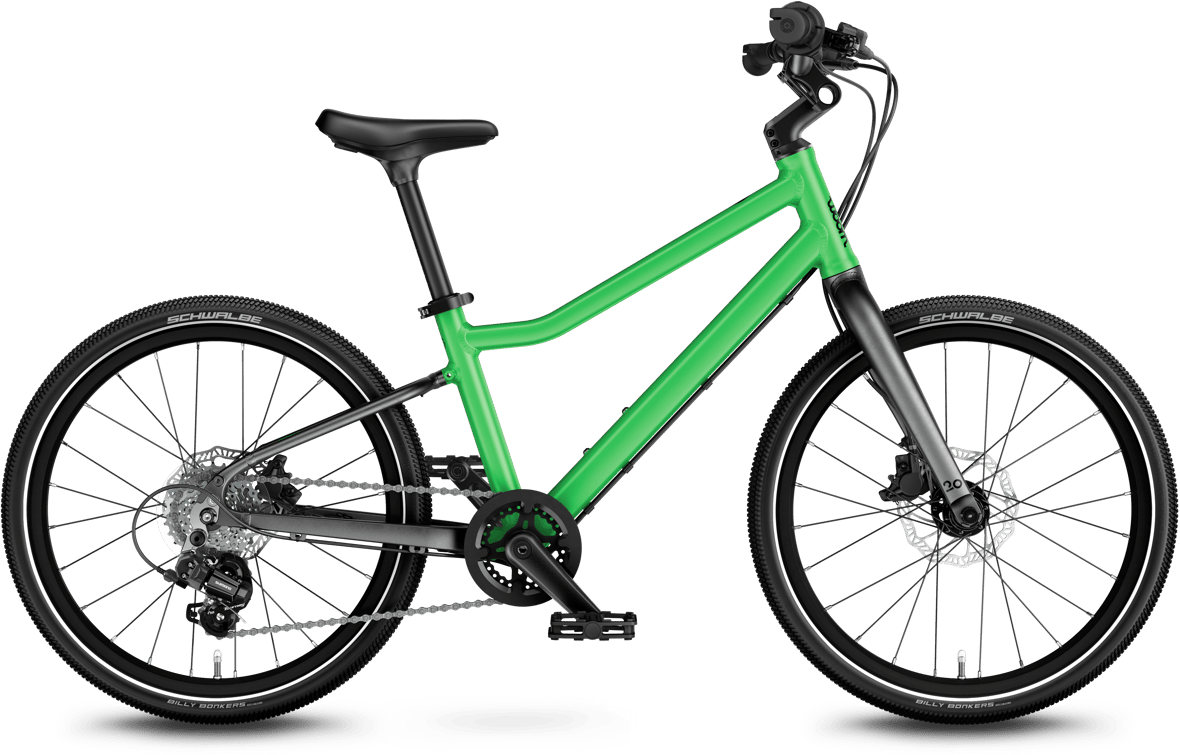 The superlight, all-rounder 20" children's bike for riders aged six and up with disc brakes, 7 gears, and all-terrain tires. Kickstand included.
